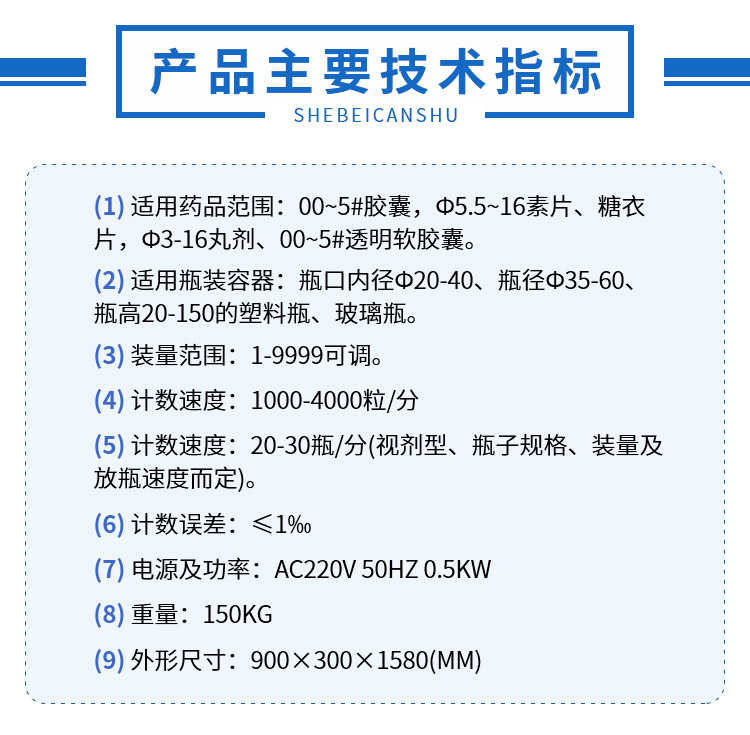(1)、適用藥品范圍:00~5#膠囊,Ф5.5~16素片、糖衣片,Ф3-16丸劑、00~5#透明軟膠囊。
